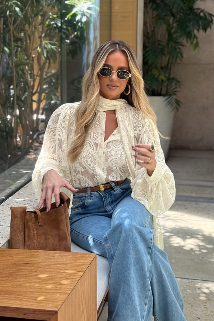 - Stile: Blusa in pizzo trasparente con fiocco al collo