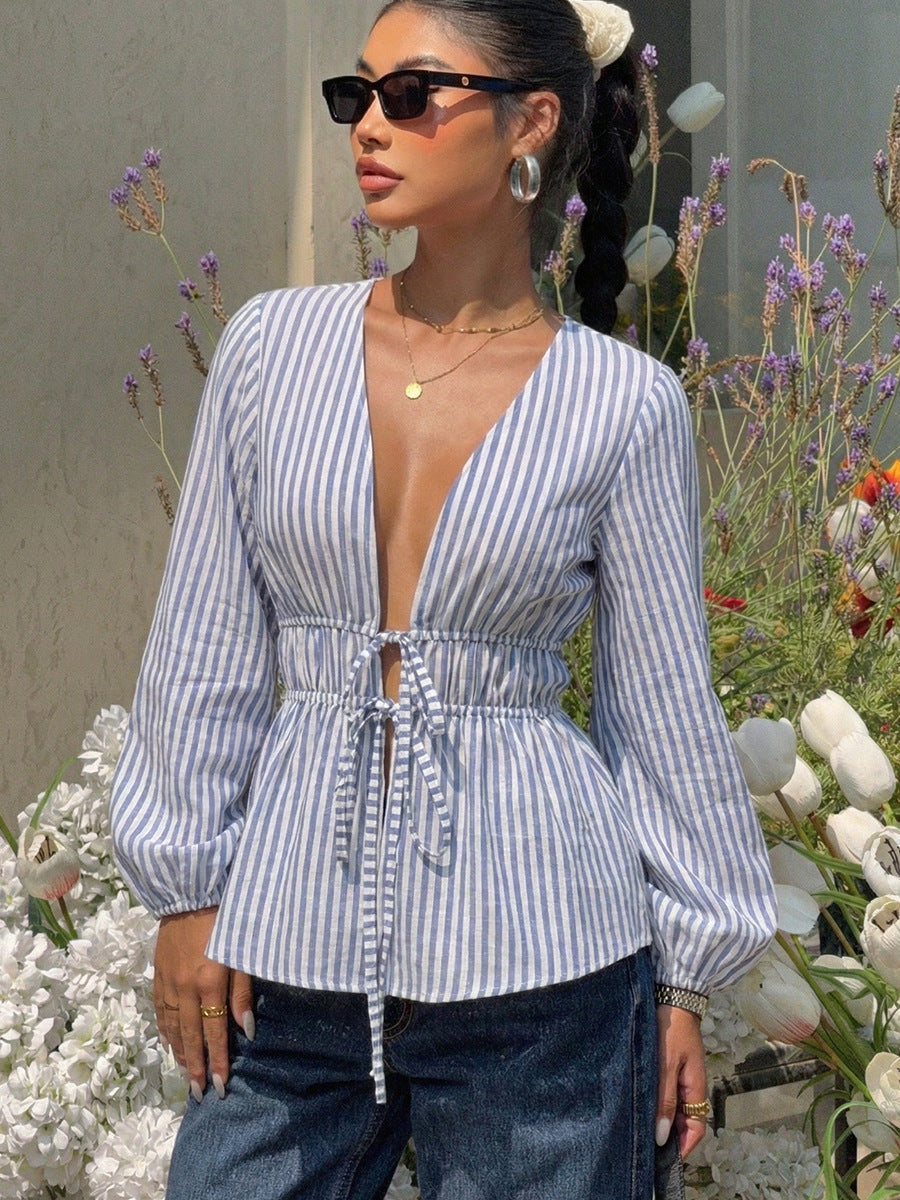 Scopri la tua nuova blusa preferita che unisce con facilità eleganza e relax. Yelena combina le classiche righe con un moderno dettaglio annodato che valorizza ogni silhouette, mantenendoti comoda tutto il giorno.